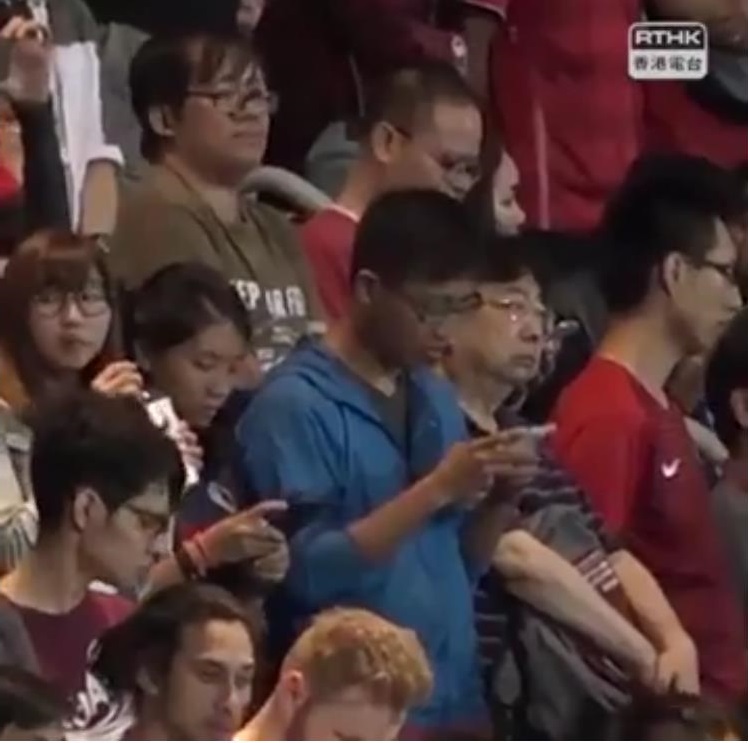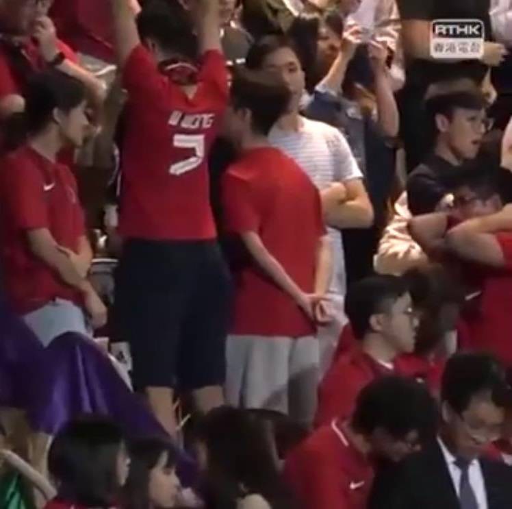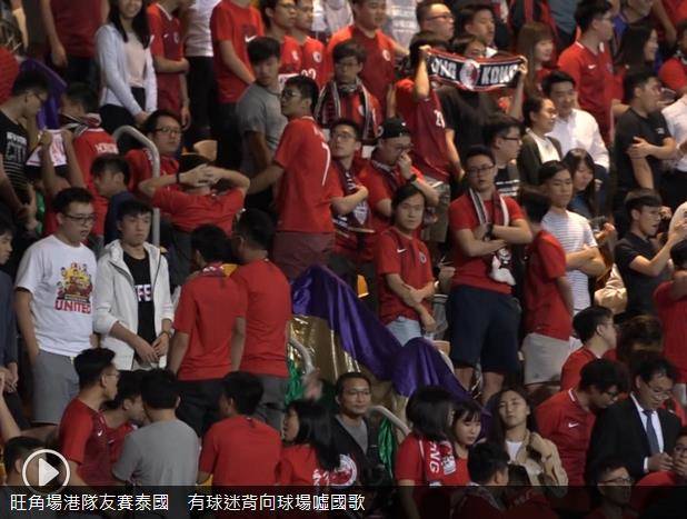據香港大公網12日報道,10月11日,香港足球代表隊當晚與泰國隊在旺角大球場舉行友誼賽。在賽前奏唱國歌時,再度發生了令人憤怒的一幕:有部分香港青年發出噓聲,並背對球場、不願意面向升旗台;另外有部分人士,則全程若無其事地低頭玩手機。