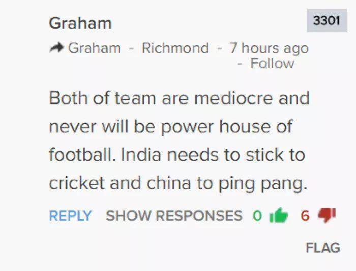 網友Graham:兩支球隊都很平庸,永遠成不了足球強國。印度還是應該堅持板球,而中國則應該堅持乒乓球。