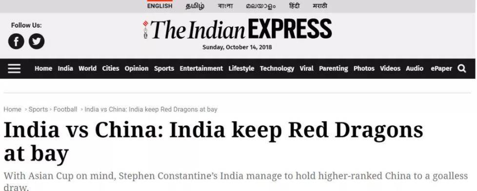 而《印度快報》的標題為“印度VS中國:印度讓紅龍陷入困境”。報道稱,考慮到兩隊的排名和客場作戰,本場平局使印度隊“獲得了士氣上的提升”。