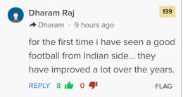 在《印度時報》的留言區,有印度網友表示很滿意印度隊的表現,期待其在2019年的亞洲盃上的發揮,也有網友表示不滿球隊的保守,還有一些調侃的留言。