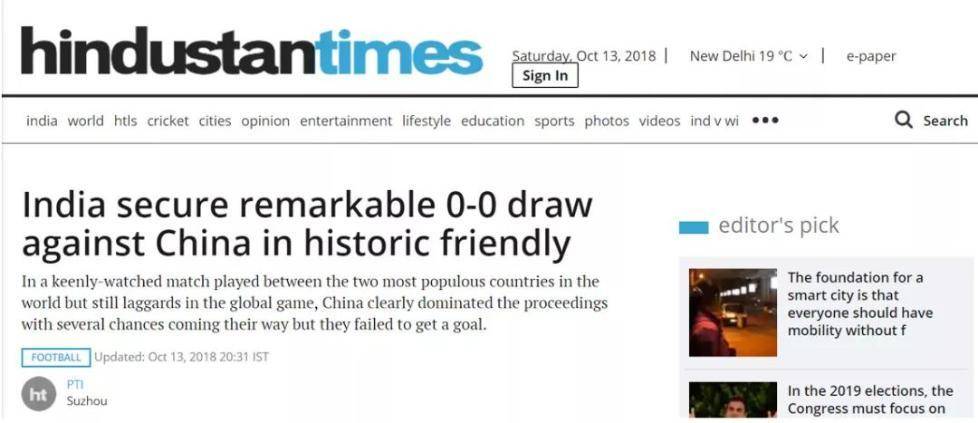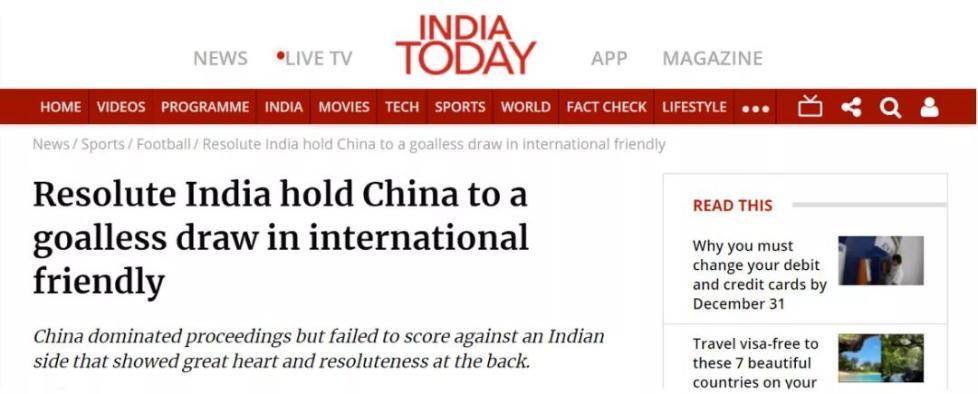 《今日印度》的標題為“堅定的印度隊在同中國隊的國際友誼賽中取得平局”,**報道正文同樣用了“堅韌不拔”這個詞來形容印度隊的表現。**報道稱,排名高於印度的中國隊雖然機會很多,但沒有取得進球,“印度的門將和後防線表現得非常出色”。