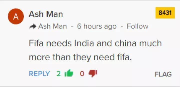 網友Ash Man:國際足聯可能更需要中國和印度,但這兩個國家可不一定。