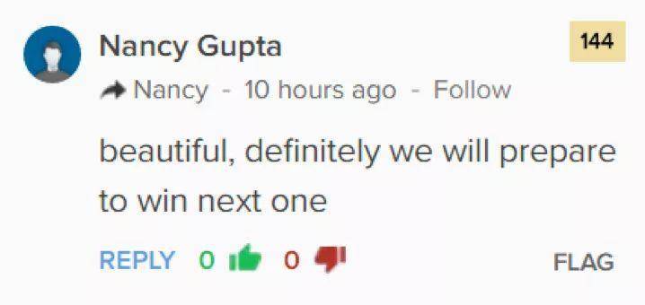 網友Nancy Gupta:漂亮,下次我們一定會贏。