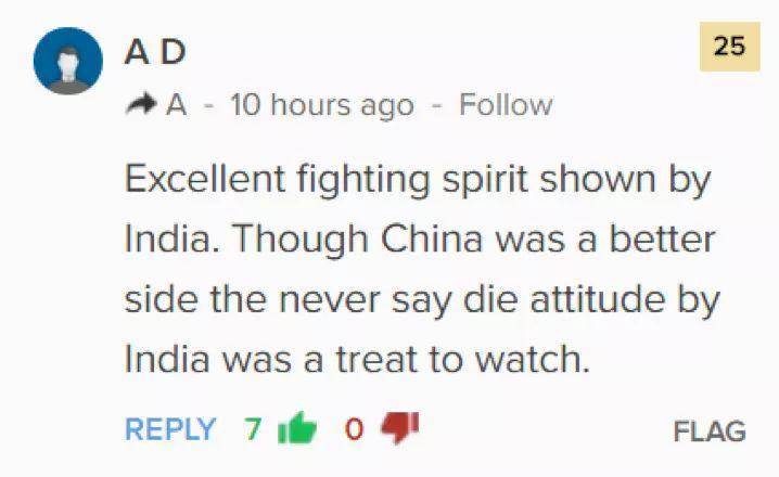 網友A D:印度隊展現出出色的戰鬥精神,雖然中國隊發揮更好一些,但印度隊永不言敗的態度值得關注。
