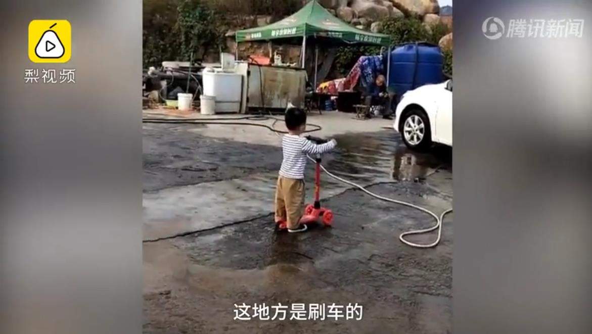 被暖到!萌娃聽説洗車行能洗車 拎滑板車來洗澡…_風聞
