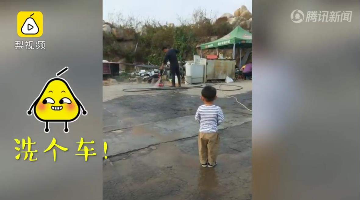 兩歲小萌娃也有禮貌地給洗車行的老闆道了謝。