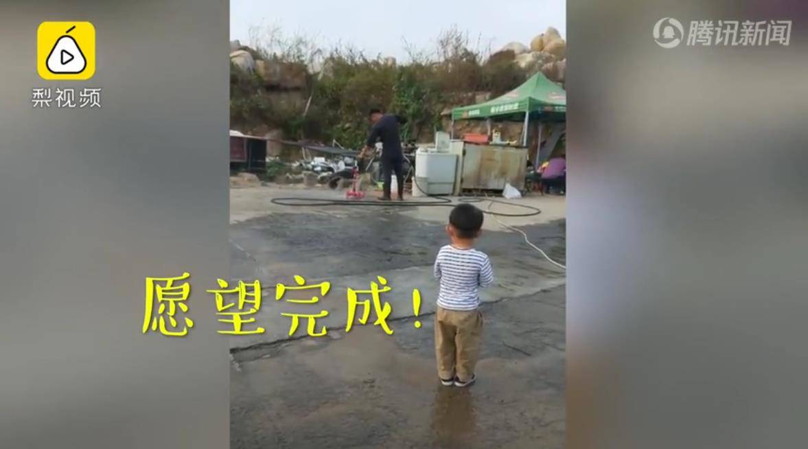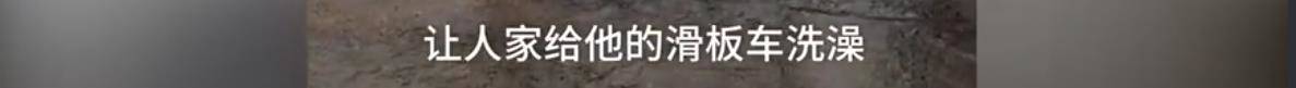 孩子看了看腳下的滑板車,説自己也想給自己的滑板車洗澡。