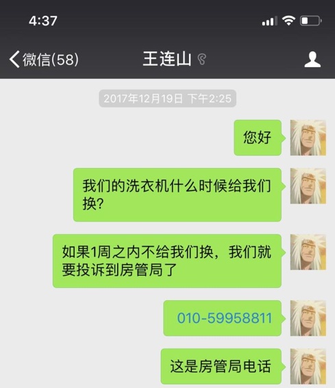 3.洗衣機老舊損壞不更換,所有租客在冬季長達3月內,只能手洗房間內的洗衣機,非常老舊,且在2017年9月損壞而無法使用,期間所有室友輪番給中介打電話,除了拖延,還是拖延,自己找來的維修工人,也無法修好。就這樣,足足拖了3個月,最後,我以投訴隔斷至房管局“威脅”(當時北京正在清理隔斷),才最終讓他們更換了洗衣機。
