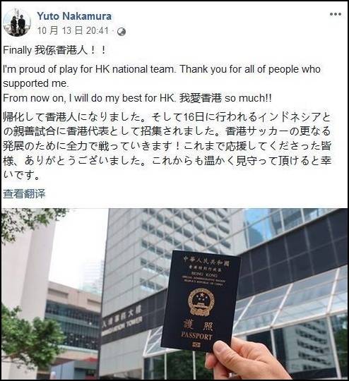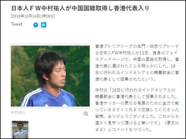 據日本媒體報道,10月13日,中村祐人在個人社交賬號上曬出自己取得的中國香港特別行政區護照,並宣佈代表中國香港隊出戰:“歸化之後,我就成了中國香港人,並將代表中國香港代表隊參加16日與印尼的友誼賽。為了香港足球得到更好的發展,我會竭盡全力而戰!感謝大家一直以來對我的支持。”