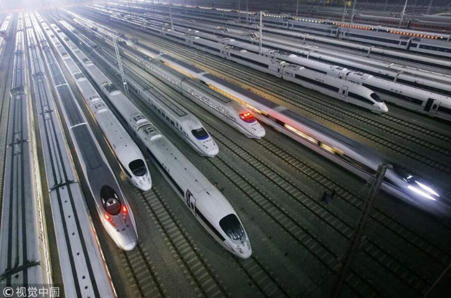2012年1月10日夜,武廣高鐵武漢動車基地燈火通明,在武廣高鐵上來回奔波了一天的30多列動車該休息了,車休人不休,武漢動車基地通宵班的百餘名員工又投入了緊張的檢修工作中 / 視覺中國