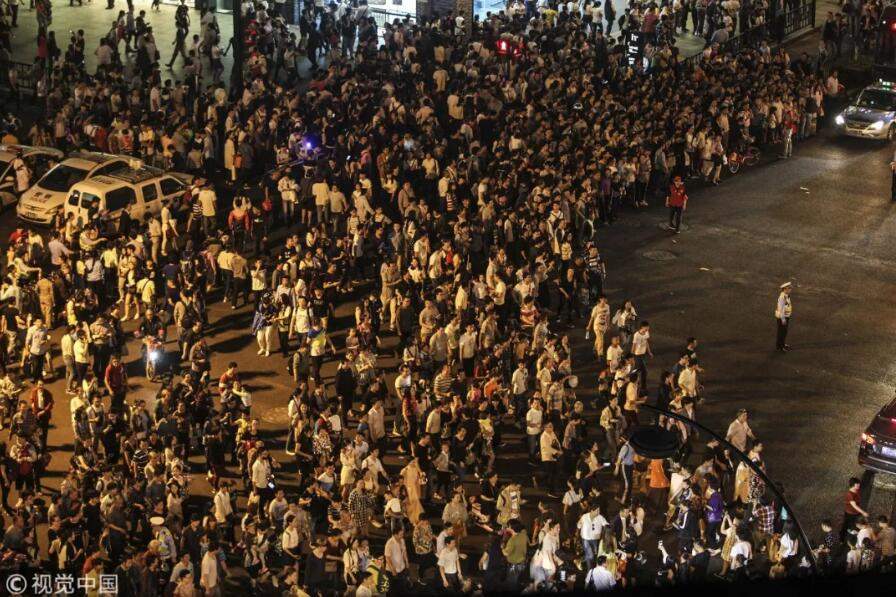 2016年5月1日,杭州,長假第一天,當晚7時許,龍翔橋地鐵站附近,看完音樂噴泉的遊客返回市區,人流密集,人們更願意選擇在發展比較好的城市工作 / 視覺中國
