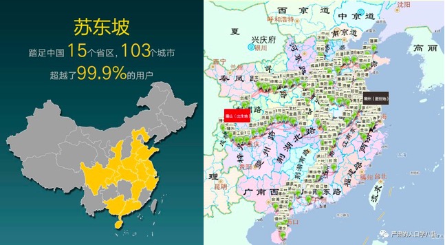 蘇東坡作為旅遊達人最優秀的地方就是每到一處都不忘記打卡,**正所謂古有蘇軾風度翩翩睹物吟詞,今有大媽彩裙飄飄景點照相。**他們共同構成了風景名勝打卡雙雄。好吧,當我們故作搞笑地講述這個故事之後,還是需要面對故事後面的悲情真相了,用準確的人口學術語來説,蘇達人其實是蘇流動,一個被迫不斷上路的流動人口。蘇東坡一生多次被貶,輾轉流離北達河北定州,南到今天的海南島儋州。難得的是在他顛沛流離的一身中儘量將三個兒子帶在身邊,不讓孩子做“留守兒童”(小知識:而當前中國由於人口遷移流動產生了 6800 萬的留守兒童)。下圖是旅遊達人蘇東坡的旅行足跡。