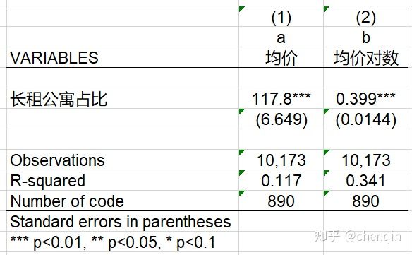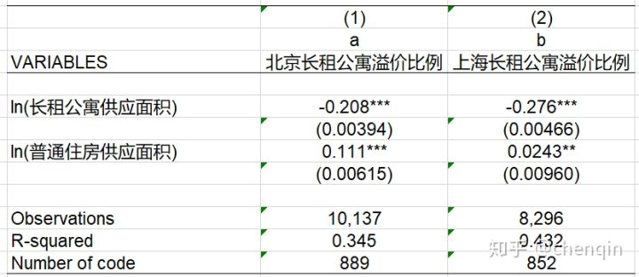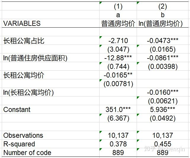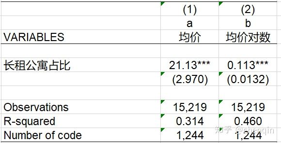的,長租公寓多佔有一些,普通住房就減少一些。那麼,如果長租公寓面對的消費者羣體和普通住房面對的消費者羣體是分割的,就會普通住房供給減少,當然會使得他的價格上升。繼續以食堂裏的普通盒飯和高級便當為例,如果有一批相對較窮的人只能支付的起普通盒飯,那麼普通盒飯供應減少之後,這批窮人裏面也只有相對不那麼窮的人能吃得起飯了,這批人之間的競爭,一樣會讓普通盒飯價格上升。我們將長租公寓的價格和普通住房的成交面積納入上面的固定效應面板迴歸,得到以下結果: