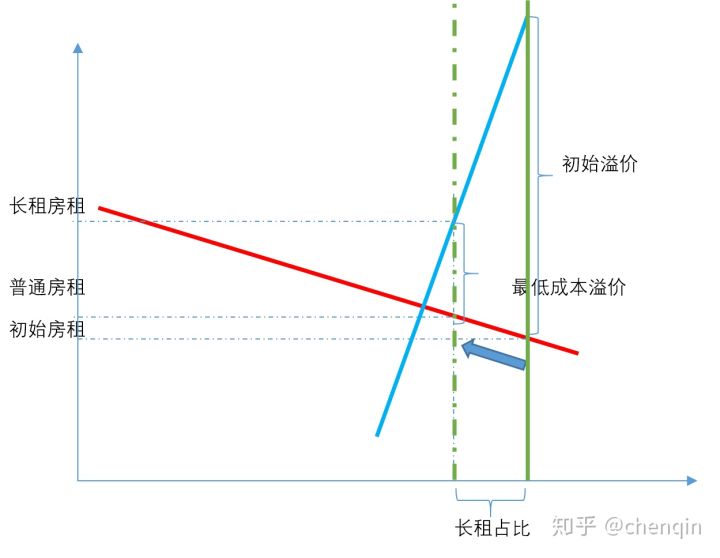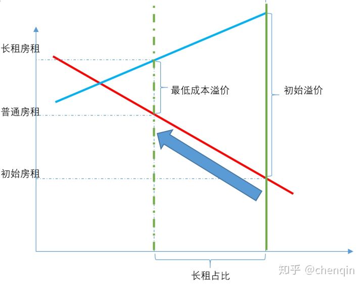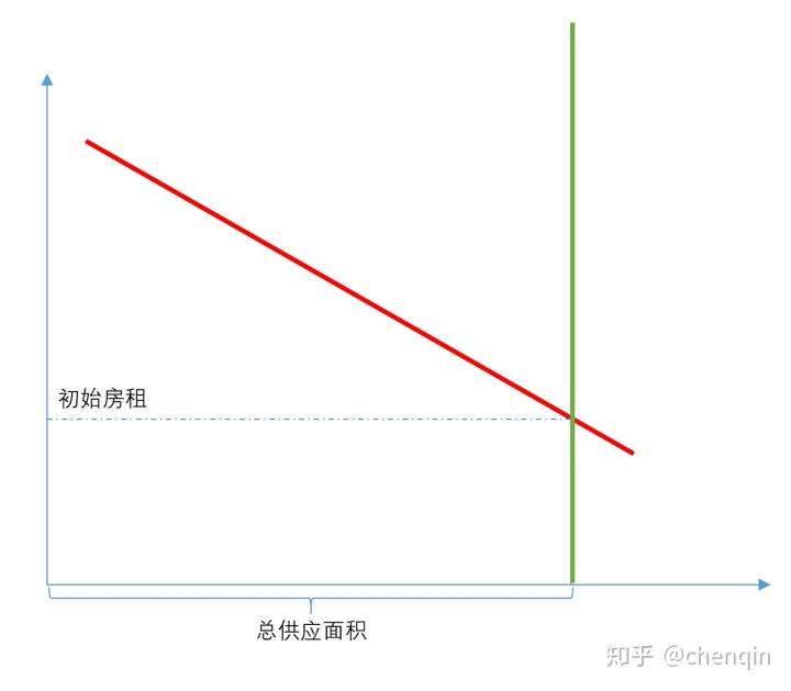 上。其次,有一條向下傾斜的需求曲線(紅線),兩者交點給出了一個初始房租。然後長租公寓來了,長租公寓將一部分普通