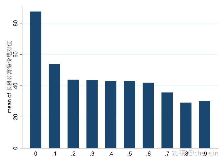 **就像一個食堂原本就賣5塊錢一盒的盒飯,現在也賣10塊錢一盒的高級便當,那高級便當供應占比越多,這個食堂的「平均價格」當然就越高了,這只是一個機械的平均結果,並沒有什麼特別的。**我們還想要看的是——高級便當的比例越大,對普通盒飯的價格會有影響嗎?正如很多觀點所提到的那樣,長租公寓佔比高的地區,不僅在平均意義上提高了地區的平均房租,還使得非長租公寓的平均房租也提高了!這個現象是否存在呢?