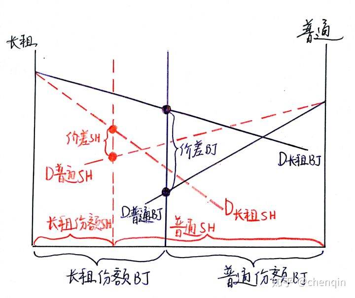 首先是紅色的需求曲線變平了,而藍色線變陡了,這説明長租公寓每多供給一點,出清的價格就會下降很多。而普通公寓多供給一些,出清價格