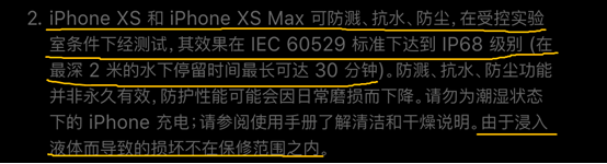 不過蘋果官網上也確實有關於iphone XS Max的防水性能介紹以及……浸入液體而導致的損壞不在保修範圍內的規定。
