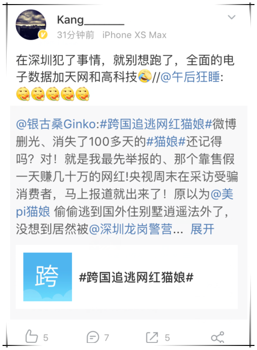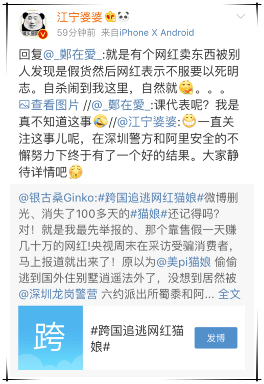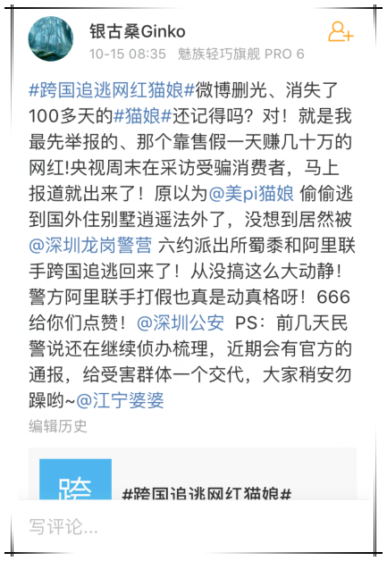 近日有博主發文並帶上了tag#跨國追逃網紅貓娘#,本以為一個賣假貨的案子,就算是報了警,在她逃到國外之後可能不會有什麼結果,沒想到深圳公安和阿里聯手打假,在我的印象裏,這也是少見的網絡售賣假貨被嚴懲的案子了。