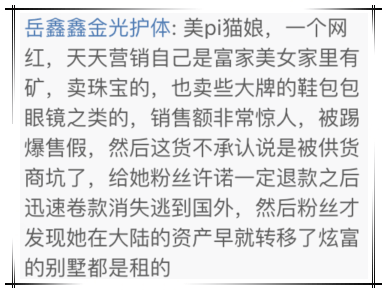 美pi貓娘,一個網紅,天天營銷自己是富家美女家裏有礦,賣珠寶的,也賣些大牌的鞋包包眼鏡之類的,銷售額非常驚人,被踢爆售假,然後這貨不承認説是被供貨商坑了,給她粉絲許諾一定退款之後迅速捲款消失逃到國外,然後粉絲才發現她在大陸的資產早就轉移了炫富的別墅都是租的 。