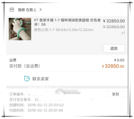 微博上還有妹子發了自己當時購買手鐲的訂單截圖(圖源見水印),我數了一起,確實是五位數沒錯。如果是我,我八成已經有了想要錘爆貓娘狗頭的心了。