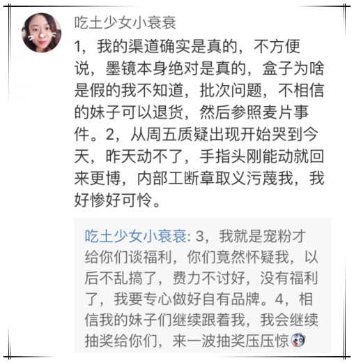 在賣假貨的事情被扒出來之後,極富甩鍋能力的她,立馬把鍋推到了供貨商身上,説自己只是被供貨商坑了。(也不知道是誰坑誰)