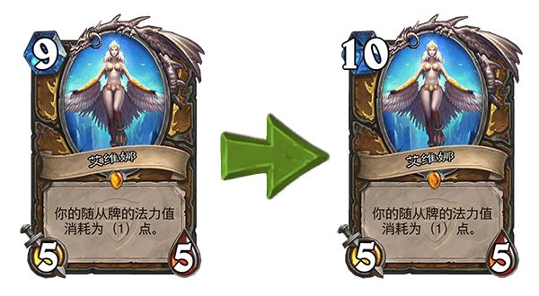 將艾維娜的法力值消耗提高到10點,意味着你無法在同一回合內使用艾維娜和遺忘之王庫恩,除非藉助其他卡牌的幫助,比如激活和幸運幣。這同時也意味着,香甜的靈力瓜無法同時抽到艾維娜和庫恩。這會降低艾維娜和庫恩的配合穩定性,但同時為喜愛這一打法的玩家保留了使用這一配合的可能。