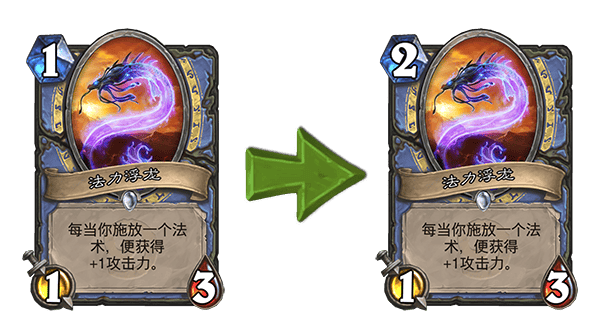 從此以往,我們會盡量避免創造出類似法力伏龍這樣過於強勢的早期1費隨從。因為有些時候,玩家會覺得整場遊戲的勝負都取決於第一回合是否有法力浮龍,以及對手是否能快速將其解掉。同時,法力浮龍讓我們在製作強大的低費法師法術時多有不便。我們希望法力浮龍依然能在適合它的套牌中保留競爭力,同時避免成為第一回合的巨大威脅。2費的法力浮龍在登場的當回合可以被更容易地應對,玩家也更難在遊戲早期使用大量低費法術來強化它。我們依然希望它能出現在擁有大量低費法術的套牌中,但它在其他核心思路的套牌中應該會不再那麼具有吸引力。