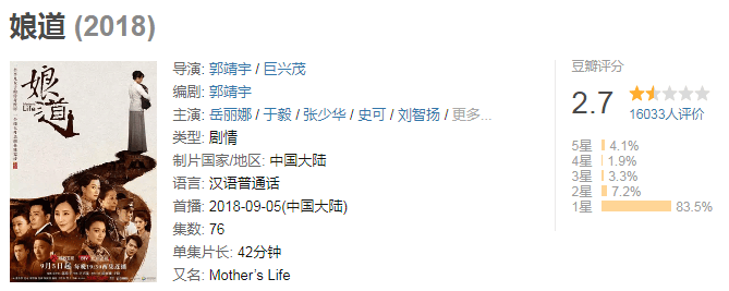 近日,9月份上演的一部神劇上了熱搜,電視劇《娘道》引發一些爭議,大家發現,《娘道》的收視率排名在多個台位列第一,但它在豆瓣上的評分卻低至2.8分,給它一個星的佔到81.6%,兩個星的也才8.1%,高收視率中如此低的評分也是少見了。對它最大的槽點,是説它三觀不正,宣揚“生兒子是女人最大價值”,過度表現男尊女卑,歌頌女人的花式跪姿等封建糟粕。