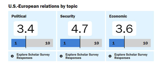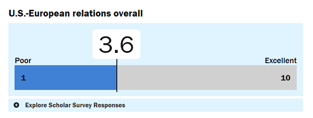 首先是對歐美關係的整體評分:3.6 (滿分10分),其中打最低分1分的專家不在少數,夠狠。