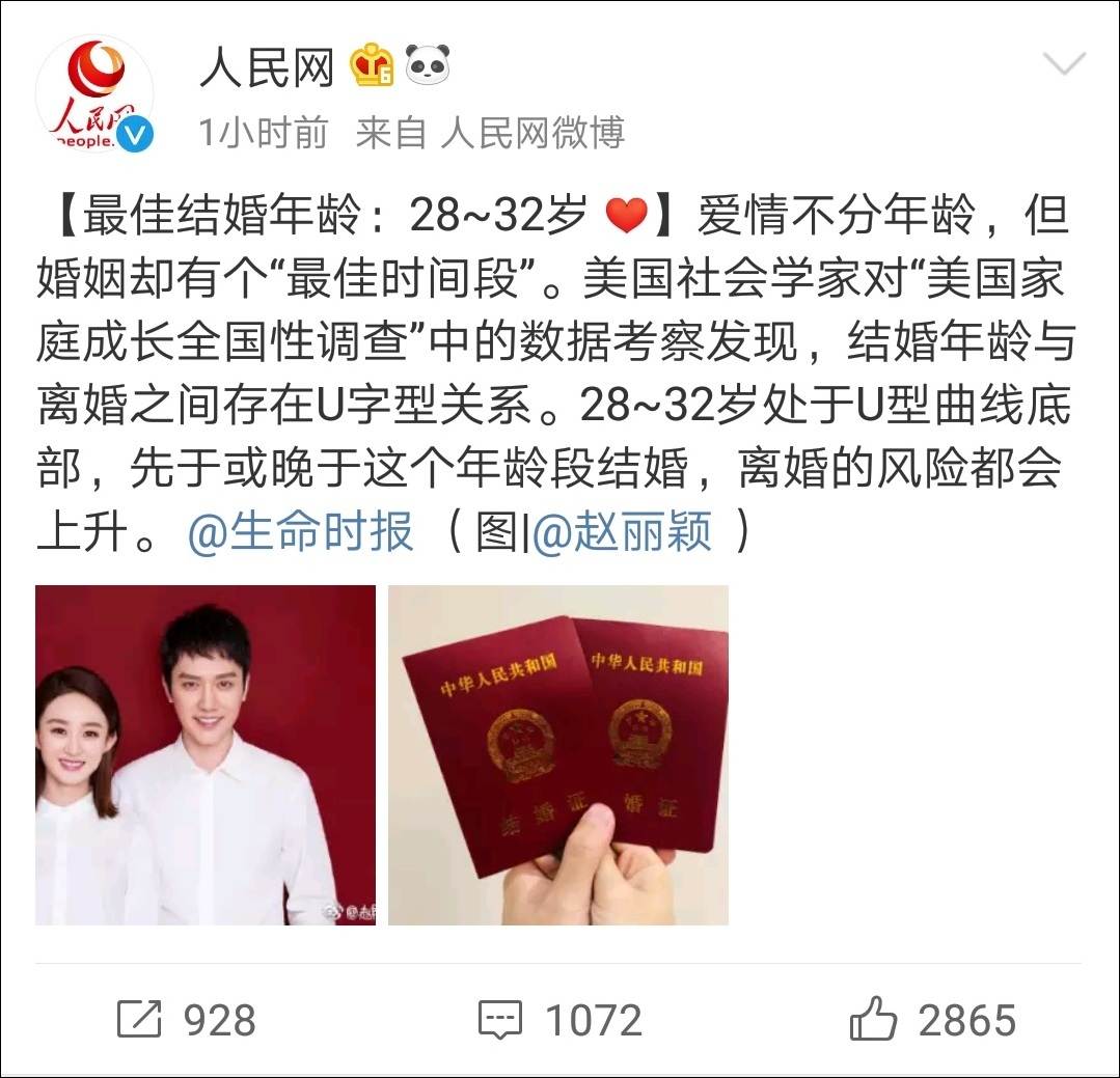 @人民網 順勢操作了一波“國家催婚”,提醒網友,最佳結婚年齡在28歲到32歲之間。