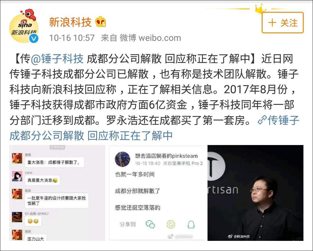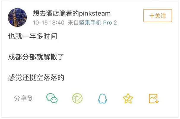 10月15日,微博用户“想去酒店躺着的pinksteam”發佈消息稱,錘子科技解散成都分公司。有網友指出,此人是錘子科技早期員工王前闖。
