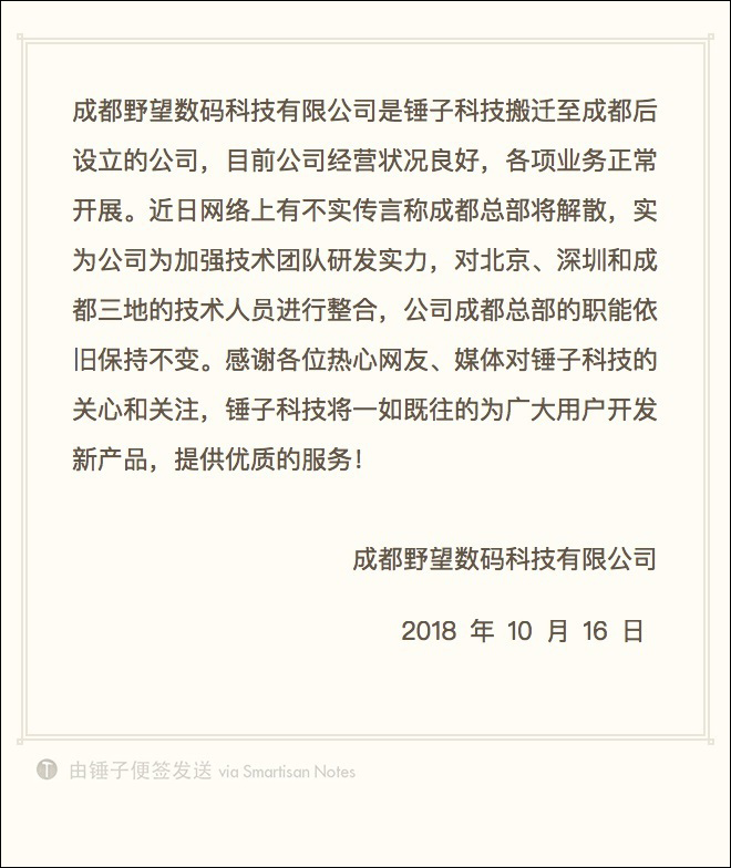 錘子科技成都分公司的消息曝光後,新浪科技詢問了錘子科技方面,對方回應稱正在瞭解相關信息。而據每經報道,錘子科技總裁彭錦洲對此回應稱,錘子科技解散成都分公司消息不實,公司將發公告澄清。