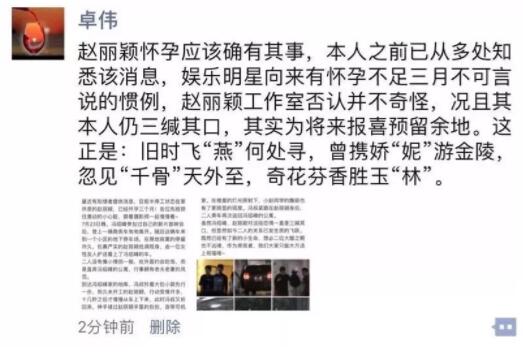 早在幾個月之前,卓偉大大寶刀不老,在朋友圈寫詩表示恭喜趙麗穎懷孕▼