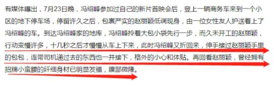 新聞描述都是趙麗穎行動緩慢,馮紹峯格外小心體貼,趙麗穎身材明顯發福,腹部微隆。