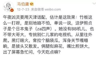 同理,天津話更不適合恐怖片,想象一下嘴比煎餅還大的貞子耷拉着腦袋從電視機裏鑽出來,問你**“今天吃點兒嘛”**……我就恨不得趕緊給她一巴掌摁進去。