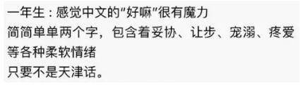 就比如,一句軟軟的**“好嘛”**在南方妹子嘴裏是耍完小性子被男友安慰之後的嬌羞。天津話一張口——