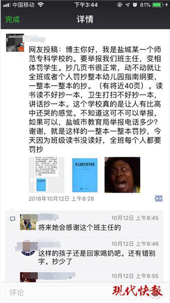 10月12日,微博“鹽城大小事兒”接到微友爆料,大致內容為,我是鹽城某一個師範專科學校的,要舉報我們班主任,變相體罰學生。抄幾頁書很正常,動不動就讓全班或者個人罰抄整本幼兒園指南綱要,一整本一整本的抄,有將近40頁。