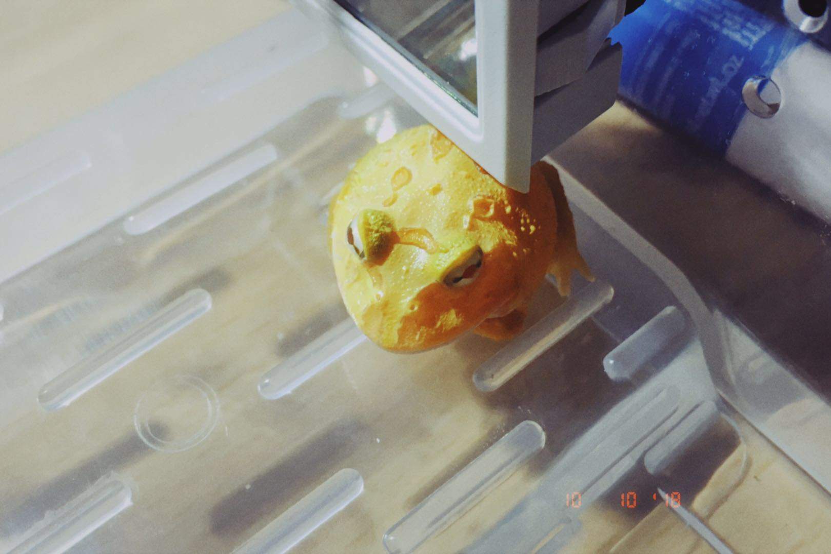 小南瓜的窩是有蓋子的,我一開始還在猶豫要不要把蓋子蓋嚴。雖然盒周有透氣孔,但還是怕會把蛙悶死。後來賣家和我説,一定要蓋嚴,不然會越獄。在我寫這篇流水賬的時候,她一直在嘗試跳出桎梏。