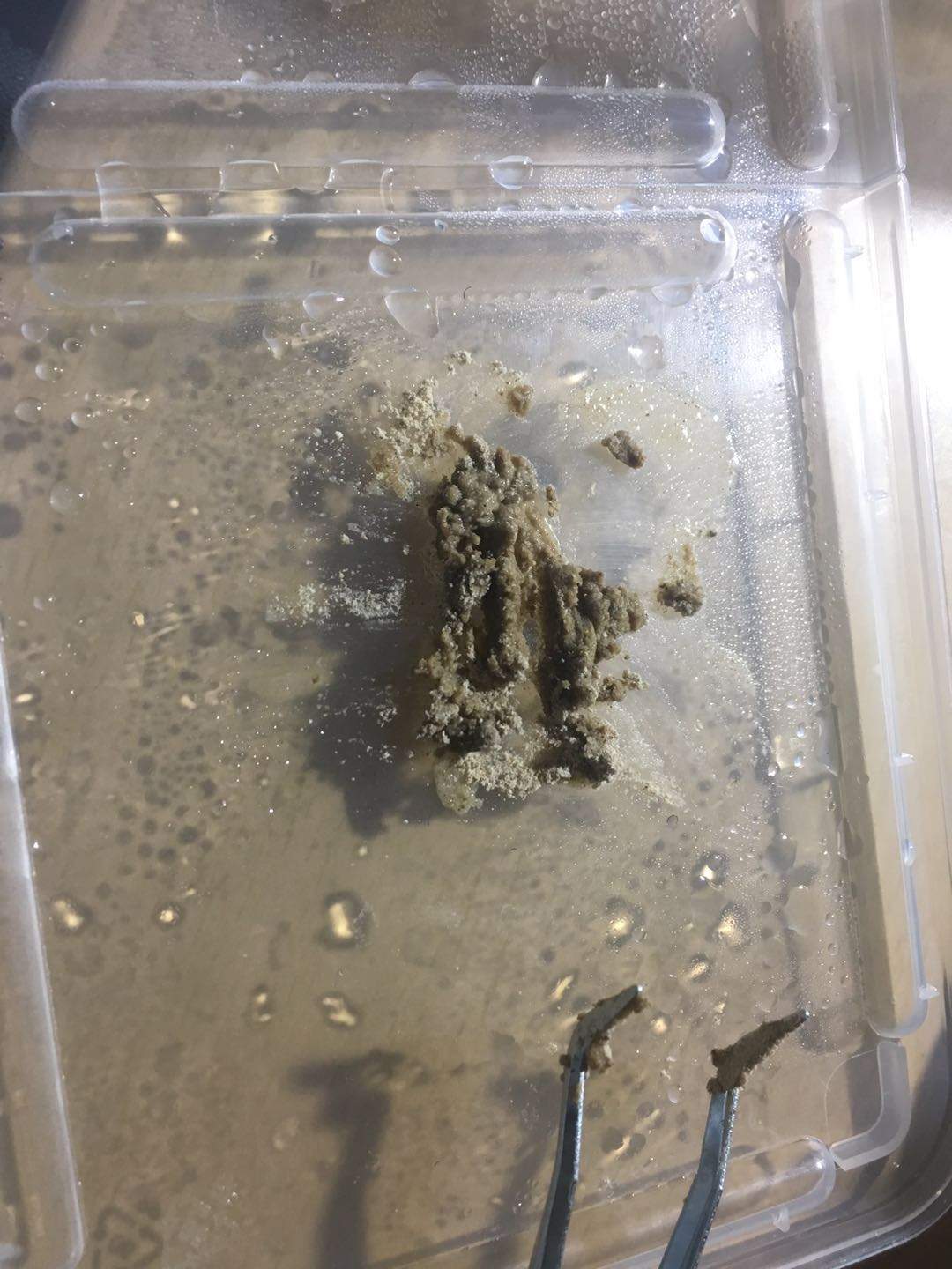 為了餵食,我們需要像和麪粉一樣,“水多了加面,面多了加水”來將這些粉末捏成顆粒。然後發現這一步驟永遠沒有盡頭,很難達到乾濕軟硬適中。而且因為角蛙糧的顏色和味道(像是腥臭的水產類粉末混合物),讓整個場面非常不堪。