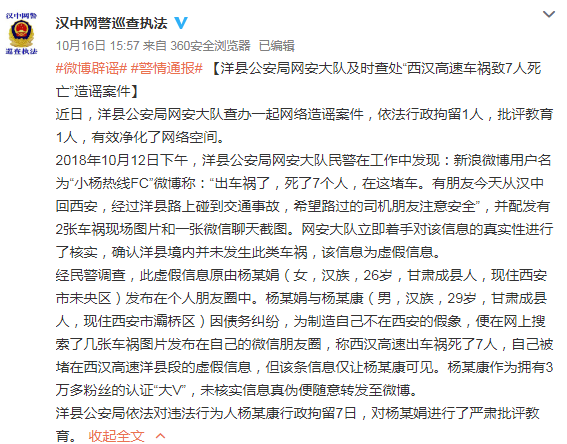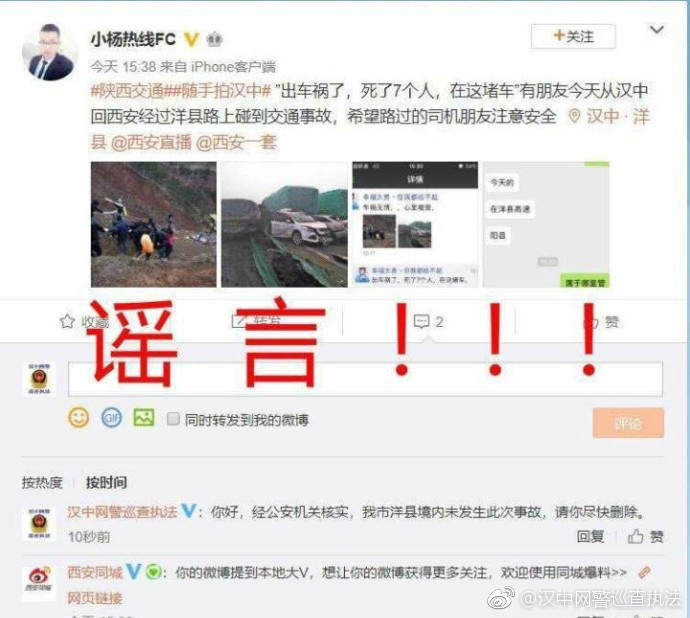 10月12日下午,洋縣公安局網安大隊民警發現:新浪微博用户名為@“小楊熱線FC”的網友發微博稱:“出車禍了,死了7個人,在這堵車。有朋友今天從漢中回西安經過洋縣路上碰到交通事故,希望路過的司機朋友注意安全。”並配發有2張車禍現場圖片和一張微信聊天截圖。