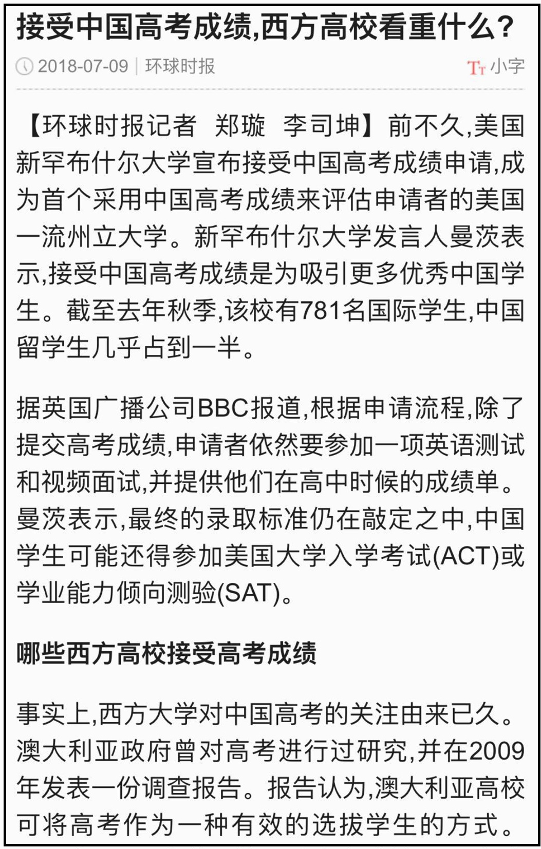 這麼一看,有沒有瞬間覺得高考的含金量漲了不少?但其實,英國之外,我國的高考成績早已被澳大利亞、美國及歐洲部分國家的高等院校認可,以至於前不久環球網還出了個申請攻略。舉幾個例子啊,