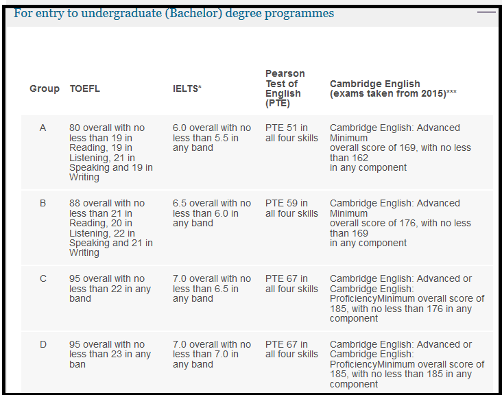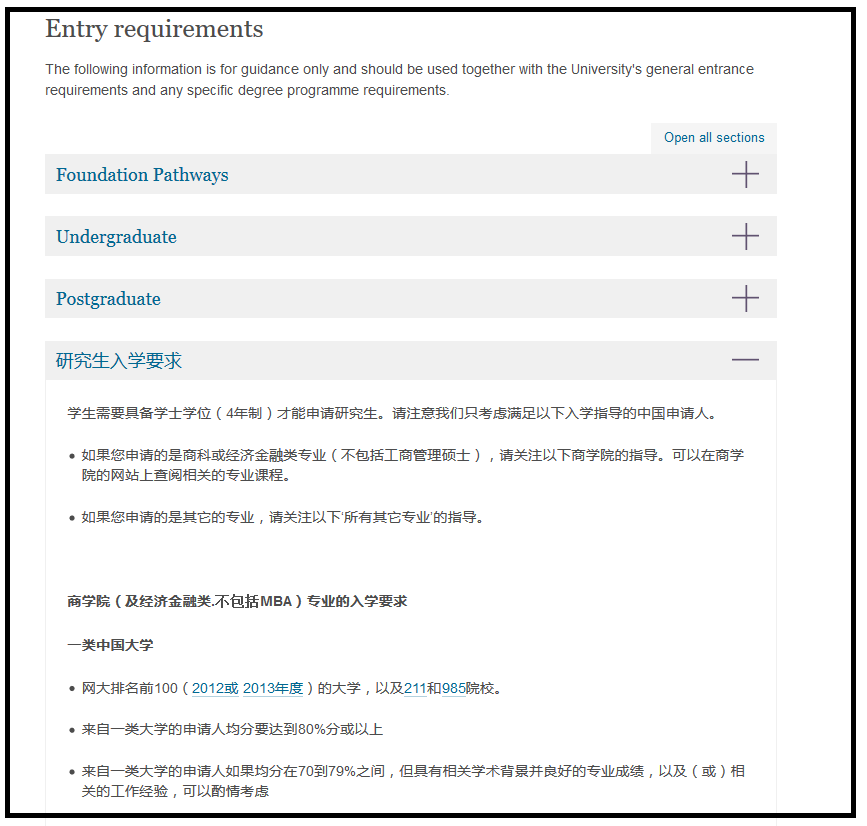 對了,上面這張圖並不是我後期翻譯統計的。這張圖原原本本截自伯明翰官網,伯明翰大學十分貼心的在這個部分給出了中國翻譯。十分有趣的是,除了高考成績要求有中文解釋以外,縱觀招生簡章,只有研究生入學要求也特意附上了中文翻譯。