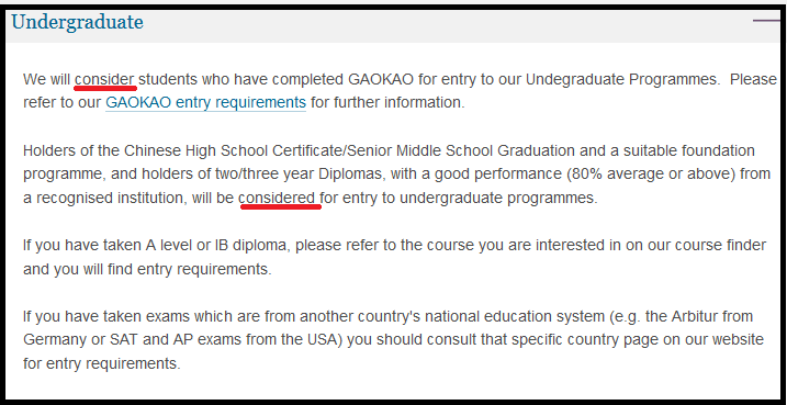 上面説的那些硬性學術成績只是一個敲門磚,是大學招生官們“看一眼”你的申請文書的前提條件。並不是説,你達到了這條線,你就能被錄取。伯明翰大學官網用的詞都是“consider”考慮。