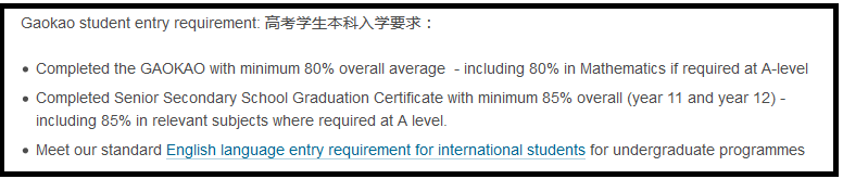 2017年,英國伯明翰大學就成和暨南大學聯合舉辦研究所。學生們可以用高考成績申請這個研究所雙學位項目。不過要是想直接申請本部的話,不僅英語水平有要求,還要完成一年的預科學習。但從2019年起,中國的學生們就可以用高考成績直接申請本部了。在伯明翰大學的招生簡章裏,對於中國高中生的要求是: