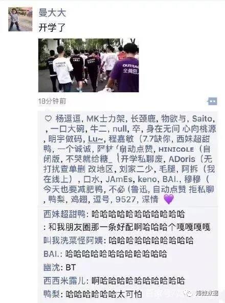 9月23日,@ 你不要臉的樣子真可愛 發佈一條朋友圈截圖,內容為“在路上看見一個穿紫色短袖的妹子背後印着四個大字:“全***。我還以為碰見全員惡人了呢,走近一看,發現人家寫着的是全面小康。”引發網友一陣“哈哈”。