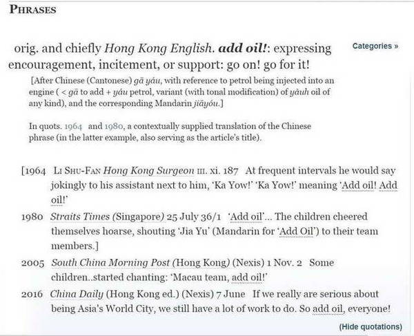 OED在詞源(etymology)裏追根究底,説add oil這個詞組直譯自中文的“加油”,廣東話念ga yau,相當於國語的jiayou,並説文解字了一番。