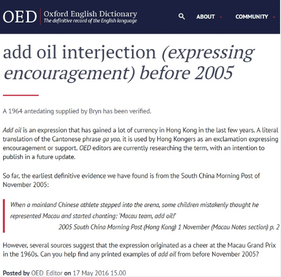 OED在詞源(etymology)裏追根究底,説add oil這個詞組直譯自中文的“加油”,廣東話念ga yau,相當於國語的jiayou,並説文解字了一番。