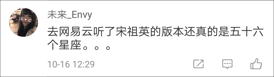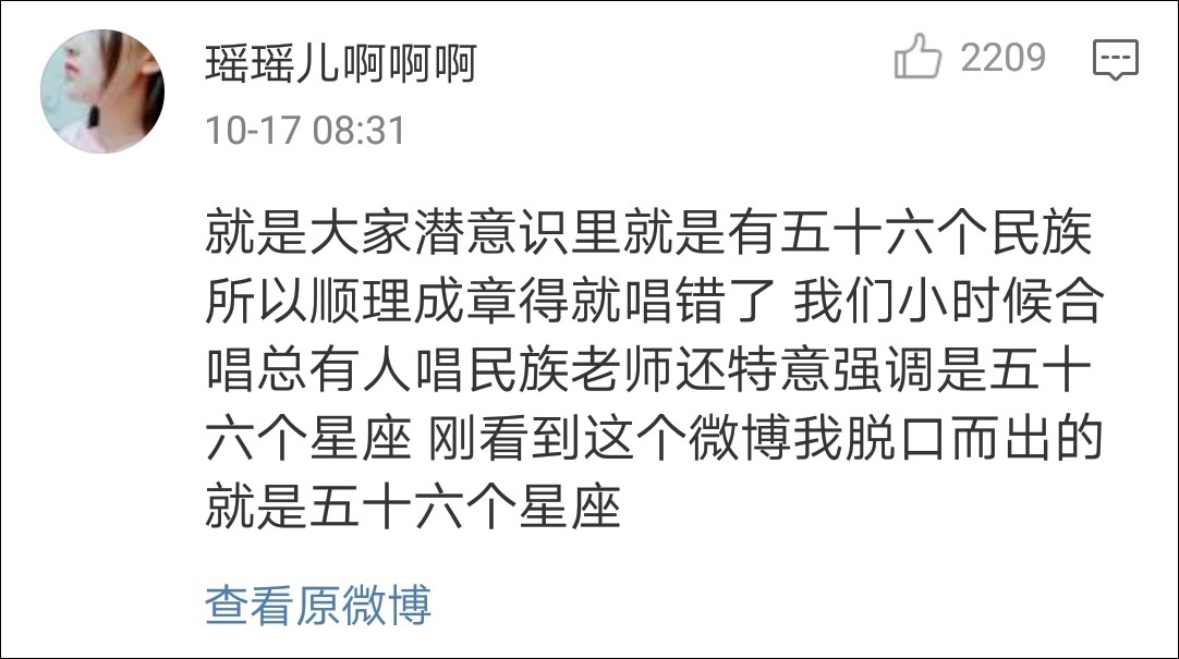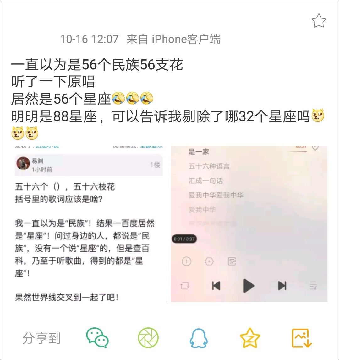 不少網友看到這個博主的發文後,也覺得自己記憶中的歌詞是“五十六個民族”,但是脱口哼曲子哼出的卻是“五十六個星座”。