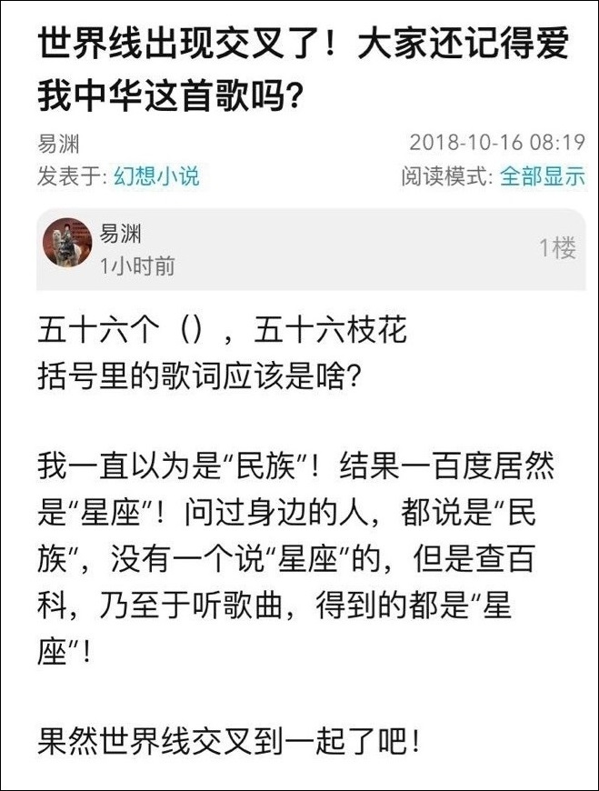 昨天,有網友發文稱,自己記憶中《愛我中華》的歌詞一直是“五十六個民族五十六枝花”,但是現在不知道為什麼網絡上的歌詞全變成了“五十六個星座五十六枝花”,深深地懷疑是不是世界線出現了交叉。