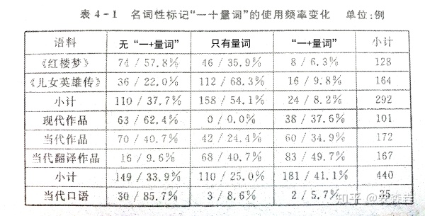 我們可以看出,進入到現代作品之後,只有量詞的情況開始鋭減,而“一+量詞”的情況開始迅速增加,而在當代翻譯作品中,“一+量詞”更是佔據了半壁江山。